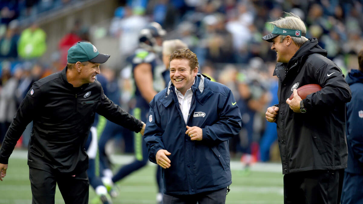 Photo Credit: SEATTLE, WA - NOVEMBER 20: General manager John Schneider of the Seattle Seahawks, center, is greeted by Philadelphia Eagles staff at CenturyLink Field on November 20, 2016 in Seattle, Washington. (Photo by Steve Dykes/Getty Images)